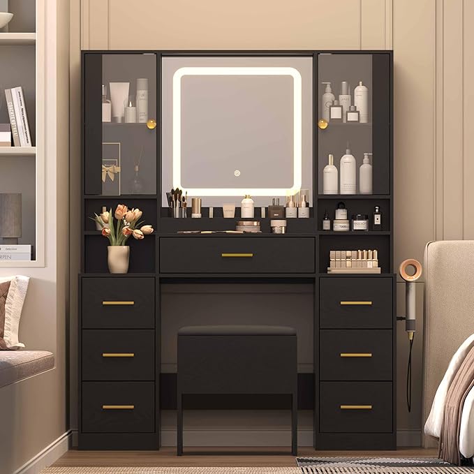 Black Makeup Vanity Desk with Mirror & Lights, Modern Vanity Table with Charging Station, 7 Drawers, Glass Cabinet, Shelves & Cushioned Stool, Bedroom Dressing Table Set for Women & Girls
