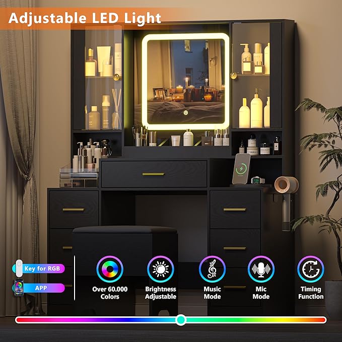 - 【RGB Lighting & Adjustable Glass Display Cabinets】This modern makeup vanity desk with mirror and lights includes 2 adjustable-height glass cabinets and colorful RGB LED strips. Use the APP or remote control to change colors and create a stylish vanity with LED lights that inspires your beauty routine.