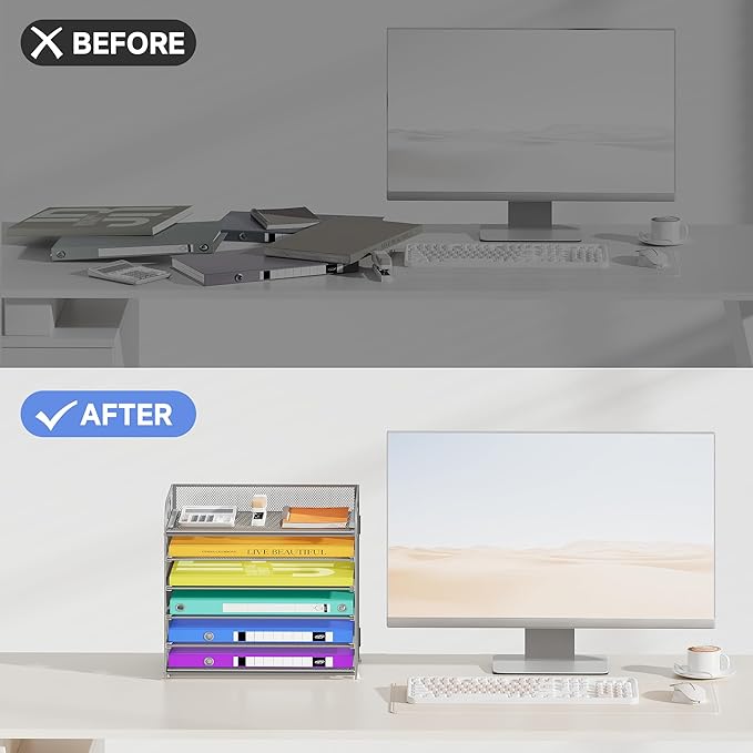 - 【EFFICIENT DESK ORGANIZER】Keep your desk tidy and clutter-free with our 6-Tier Paper Organizer with Handle. This file organizer provides ample space for sorting and storing papers, letters, documents, folders, books, magzines, staplers, caculators and sticky notes.