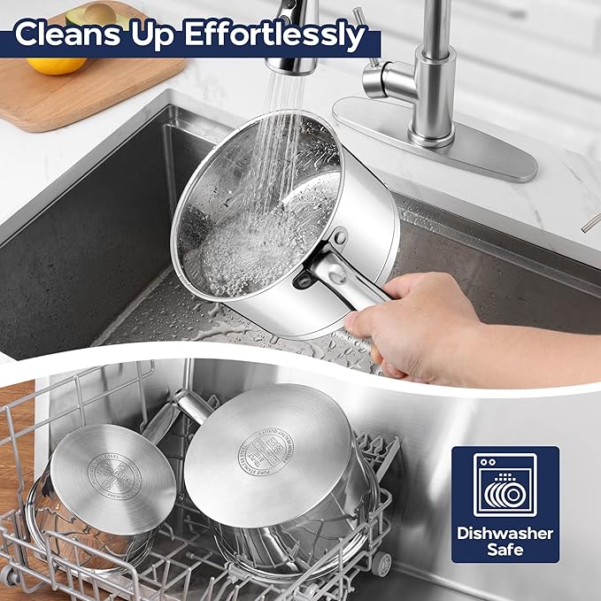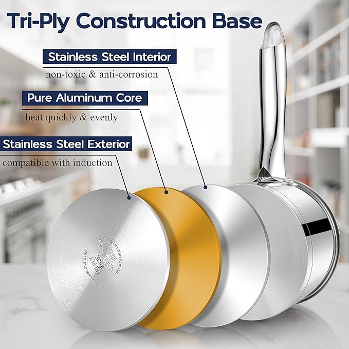 - Suitable for all Stovetops: the stainless steel saucepan is constructed of try-ply bottom, with an aluminum core for even heat distribution and quick heating, also compatible with all cooktops, including induction, gas, electric, and ceramic, meets your versatile cooking needs