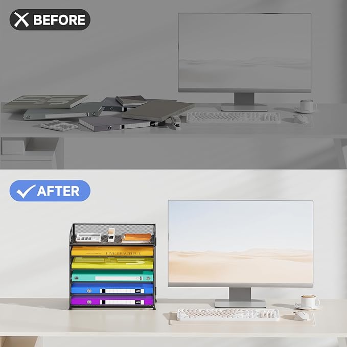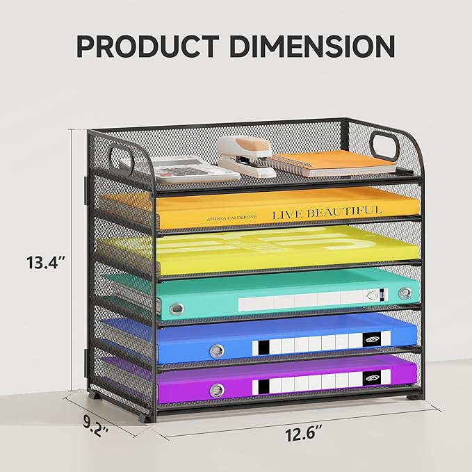 - 【EFFICIENT DESK ORGANIZER】Keep your desk tidy and clutter-free with our 6-Tier Paper Organizer with Handle. This file organizer provides ample space for sorting and storing papers, letters, documents, folders, books, magzines, staplers, caculators and sticky notes.
