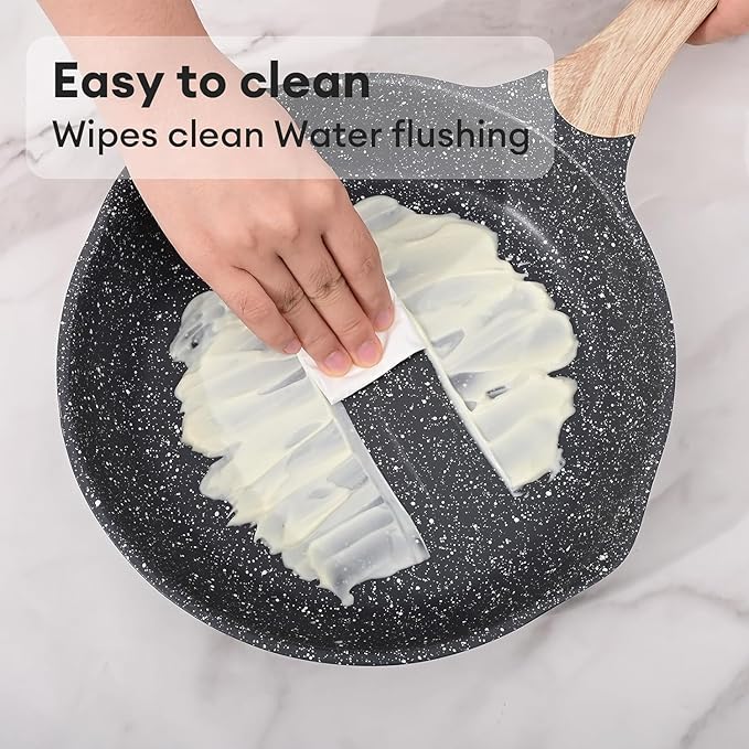 - 【EFFICIENT AND ENHANCED NON-STICK PERFORMANCE】 The smooth surface of the ceramic makes the non-stick performance also very good, eggs, food debris can be easily slid out of the bottom of the pan, not easy to leave food residue. The physical non-stick surface ensures that the original flavors of the ingredients are fully retained, optimizing the cooking experience, while using less oil to add more flavor to the food.