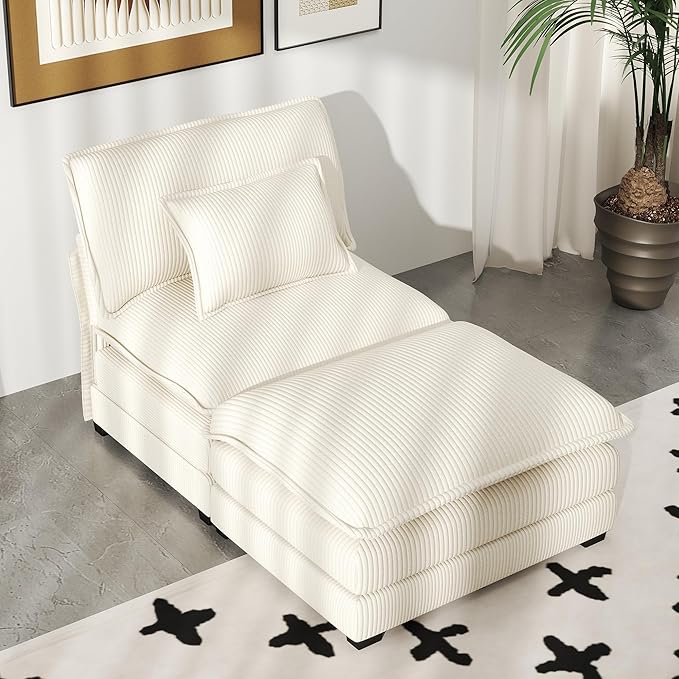 Real Relax 34.9'' Modular Sectional Sofa, Single Seat Without Armrest Corduroy Convertible Couch with Movable Ottoman, 2 Pillows for Living Room, Office and Leisure Places, Beige