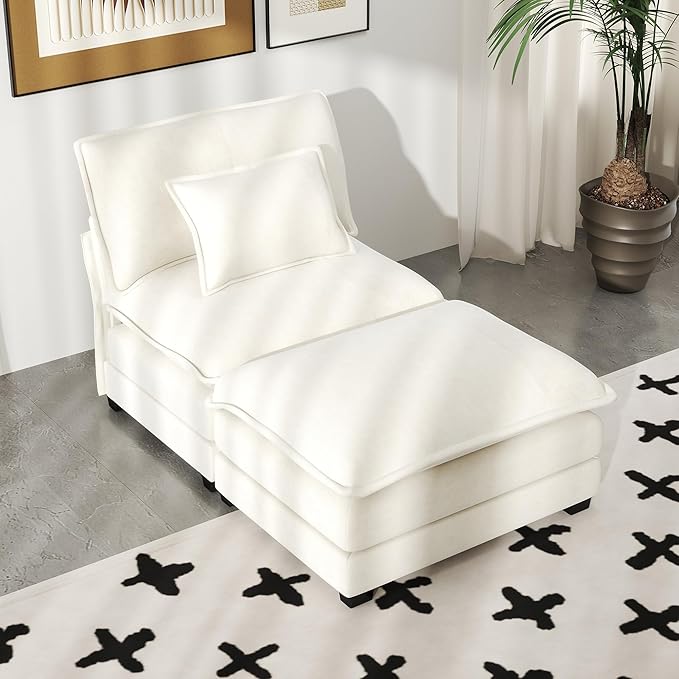 Real Relax 34.9'' Modular Sectional Sofa, Single Seat Without Armrest Chenille Convertible Couch with Movable Ottoman, 2 Pillows for Living Room, Office and Leisure Places, Beige
