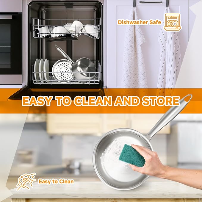 - Easy to Clean and Maintain: This steamer for cooking with a steamer basest is designed with smooth edges and no sharp corners, ensuring safety for your hands while making it easy to clean by hand. For quick cleanup, simply use hot soapy water and a non-abrasive scrub pad. Its mirror-polished exterior of this cooking pot is dishwasher-safe, offering added convenience. The large hole at the end of the pot handle allows for easy wall hanging, helping to save valuable kitchen storage space.