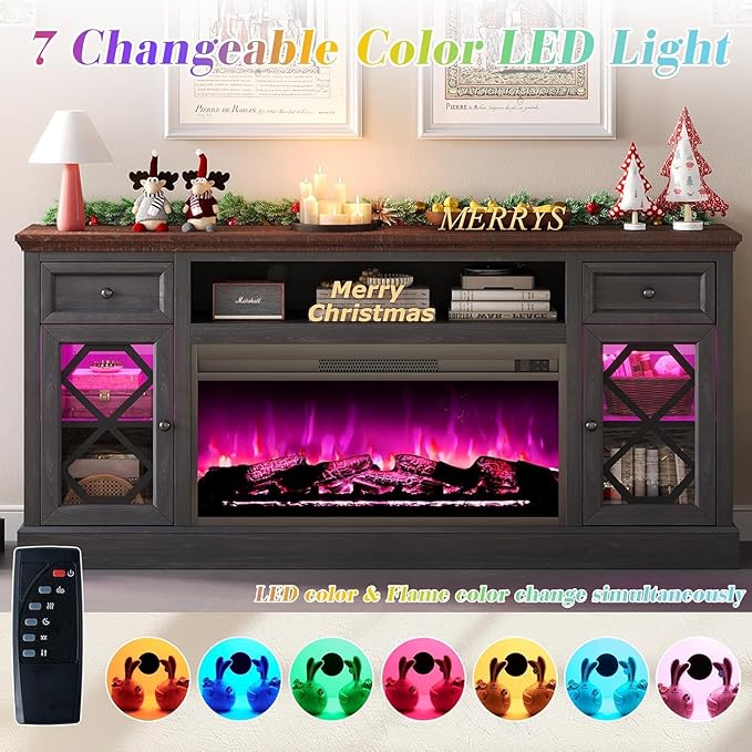 - Large Fireplace TV Stand - 70" Wide tabletop in fireplace console accommodates TVs up to 80 inches. Combining 7-color flame with 7-color LED enhances visual enjoyment, creating an entertainment space filled with storage & stylish.