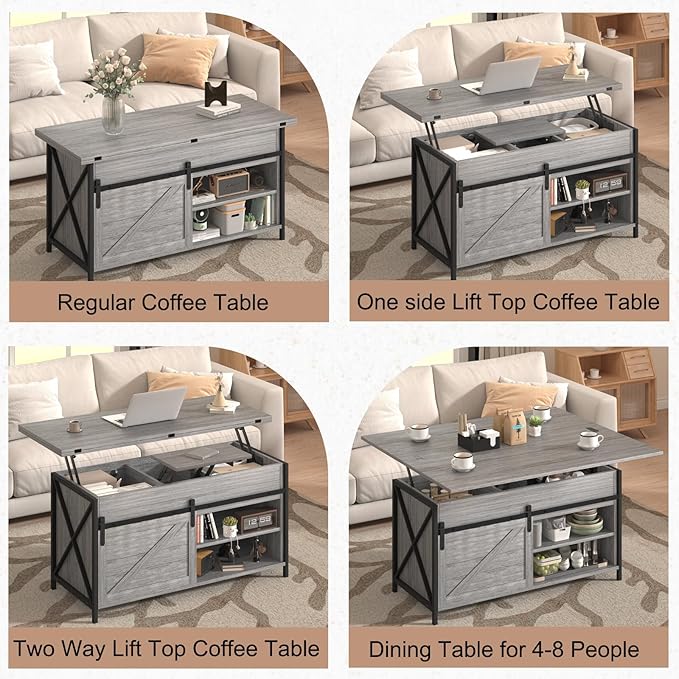 - Smart Storage Solutions: The generous tabletop offers plenty of space for working, dining, or entertaining. A spacious hidden compartment beneath the lift-top is perfect for storing pillows or throw blankets. Below, an open shelf and sliding barn door cabinet keep essentials like laptops, books, and remotes within easy reach. The adjustable 3-level interior shelf lets you customize the space to fit your needs—ideal for maintaining a clean, organized living area with a tailored touch.