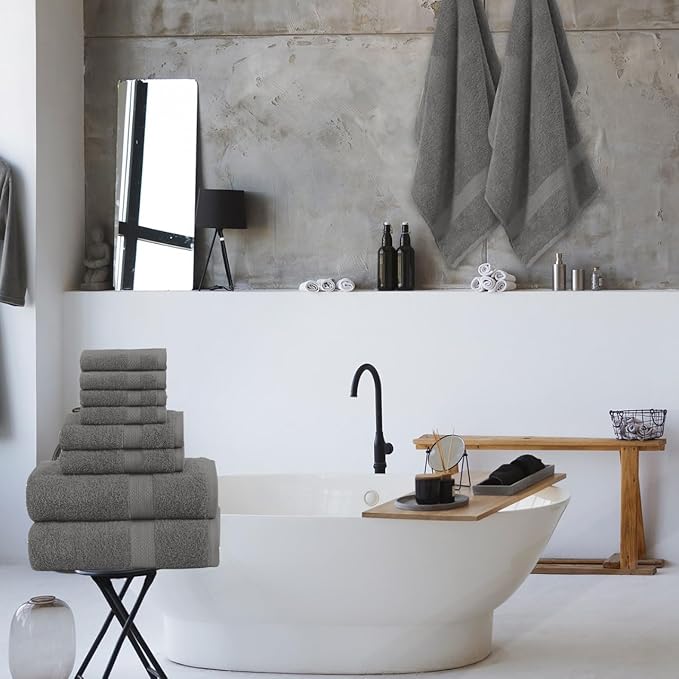 Pack of 8 Towels Set, 2 Large Bath Towels, 2 Hand Towels, 4 Wash Cloths, 100% Cotton, Lighter Weight, Quicker to Dry, Super Absorbent, Perfect for Bathroom (Grey)