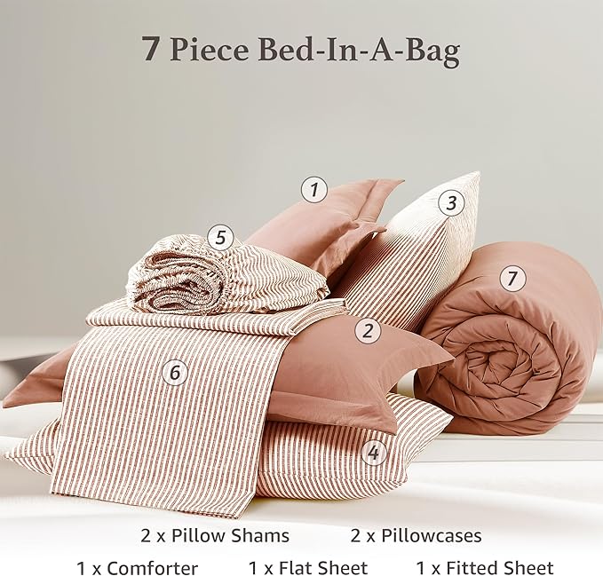 - 【Bed in a Bag Queen】Queen comforter set 7 pieces: 1 comforter 90''x90'', 1 flat sheet 90''x102'', 1 fitted sheet 60''x80''+14'', 2 shams 20''x26'', 2 pillowcases 20''x30''.The decorative pillow and blanket used in the photo shoot are not included in the package.