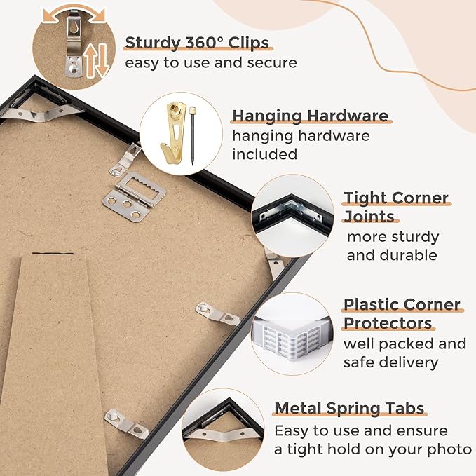 - Clean Mat-Free Presentation: Showcase memories directly against crystal-clear 2mm glass for a modern, borderless look. Our 9x11 metal frame Perfectly displays photos, certificates, and even delicate fabrics without distracting mats