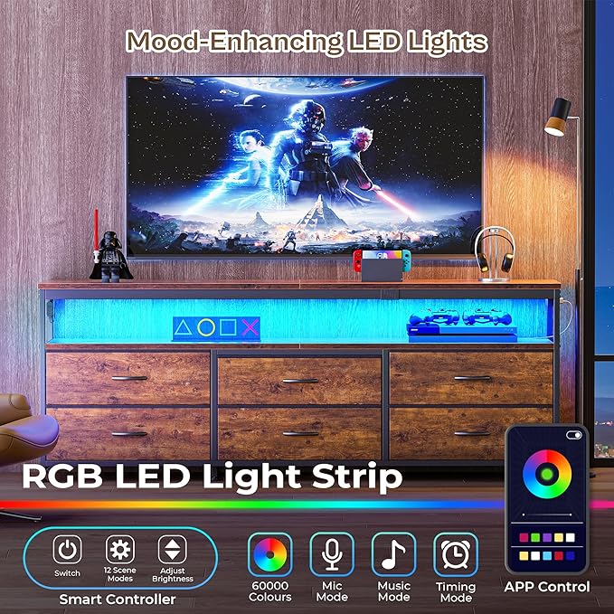 - 【Power Outlets & LED Lights】Equipped with 2 AC outlets, 2 USB ports and 1 Type-c port, this TV stand with storage offers convenient charging for your TV, gaming equipment, and other electrical devices. Use LED lights on the fabric dresser to add watching vibes via smart controller or use the app to explore over 60,000 colors, timing mode, mic mode, and music mode. What's more, you have the option to install these outlets on either the left or the right side, whichever suits your usage better and maximizes your convenience