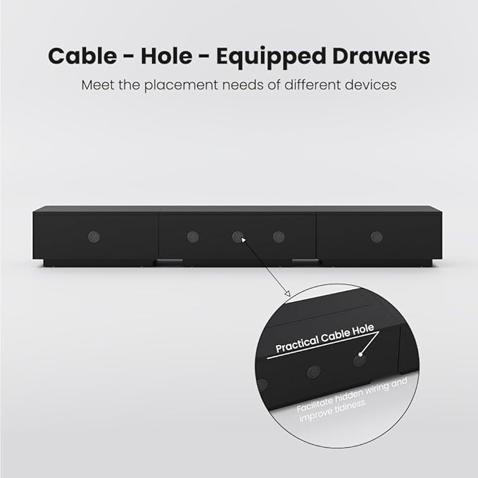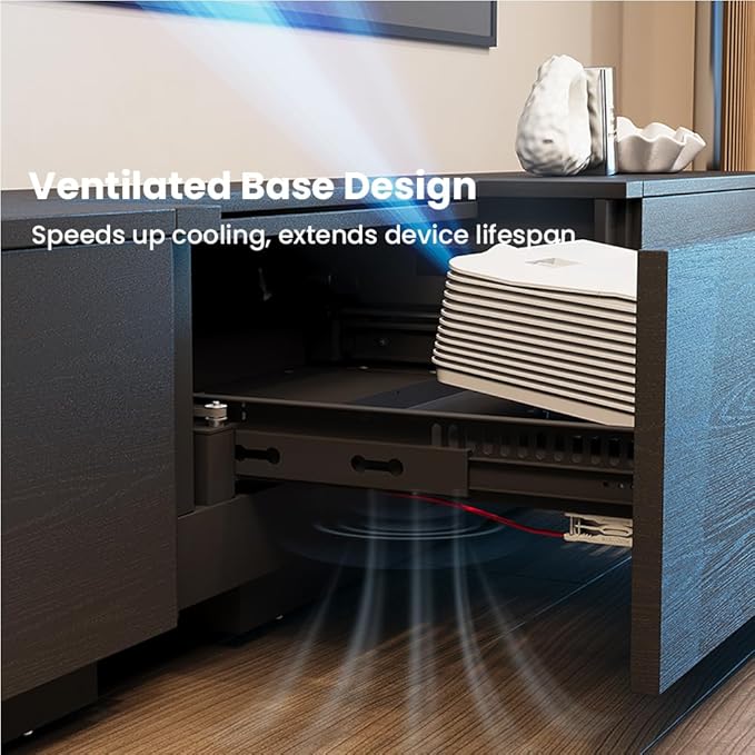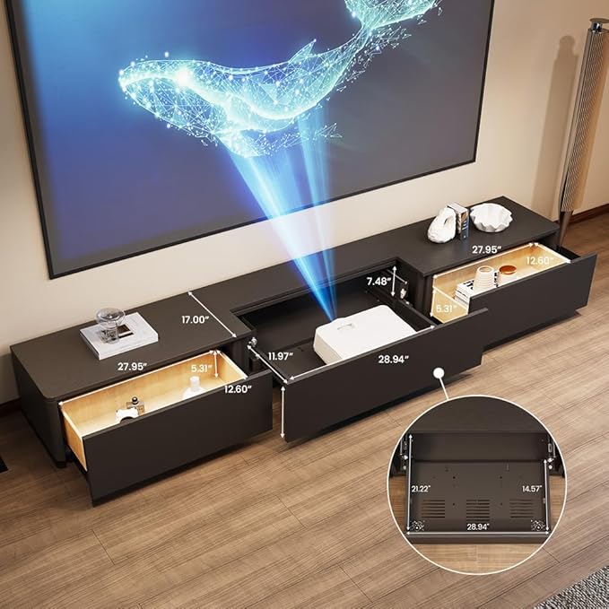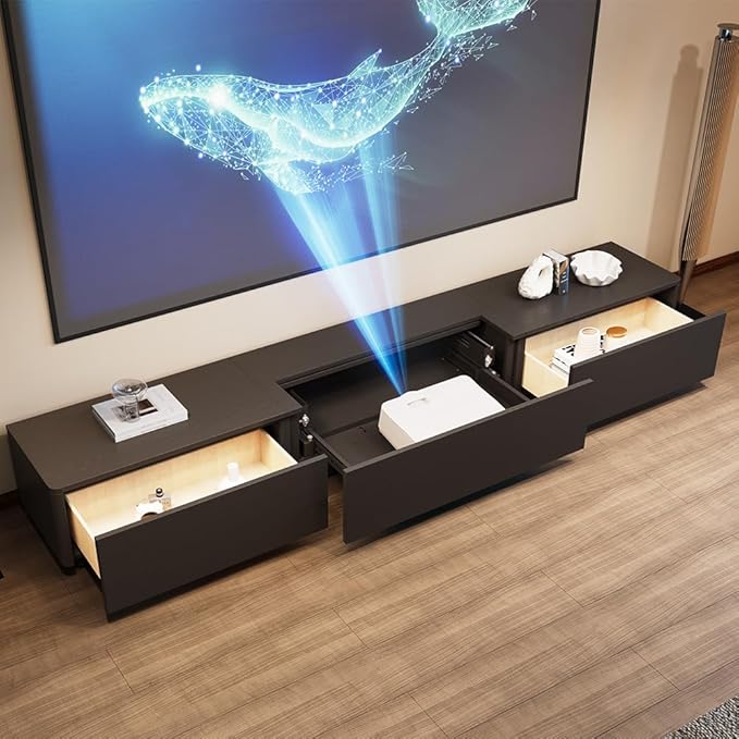 - [ Smart Drawer Interaction ]This TV cabinet is equipped with a CE-certified intelligent electric telescopic platform, boasting an excellent load-bearing capacity of 30 kilograms, sufficient to support your projector. When you need to use the projector, the drawer will automatically open and revert to the projection distance you have set; when not in use, the drawer will close to protect the projector from dust and accidental damage.