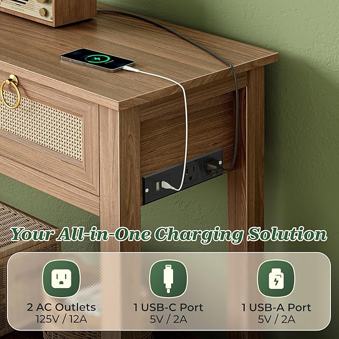 SUPERJARE Rattan Console Sofa Table with Outlets and USB-C Port, 2 Drawer Entryway Table with Synthetic Rattan Surface, 39 Inch, Open Shelf, Behind Couch Entry Foyer Hallway Storage, Brown