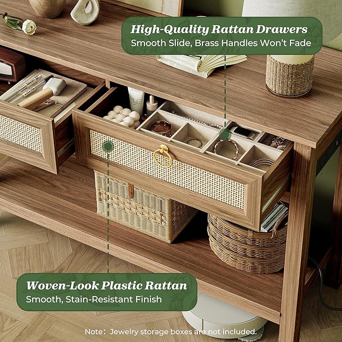 - 【Farmhouse Sofa Table】The natural synthetic rattan combined with brown tones brings a breezy, boho elegance to your space. Whether your home leans Scandinavian, Japandi, vintage American, or tropical retreat, this console table with drawers fits right in. Plus, the water-resistant top wipes clean, helping you maintain that fresh, airy vibe every day