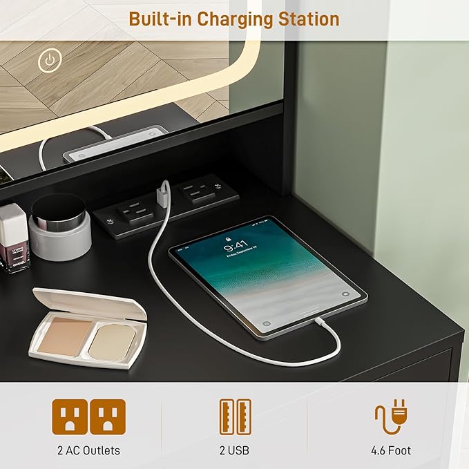 - 【Vanity Desk with Charging Station】: This vanity desk comes equipped with an integrated charging station featuring two USB ports and two standard outlets, allowing you to charge multiple devices simultaneously. The charging station is discreetly embedded in the tabletop, saving space and maintaining a clean aesthetic.