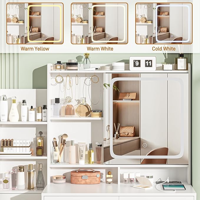 - 【Perfect Gift for Her】: The Vabches Makeup Vanity Desk is the ultimate gift for mom, daughter, wife, and friends. With its elegant design, three LED lighting modes, built-in charging station, and ample storage, it combines functionality with style. This versatile vanity enhances daily routines and adds a touch of luxury to any bedroom, making it a thoughtful and practical gift choice.