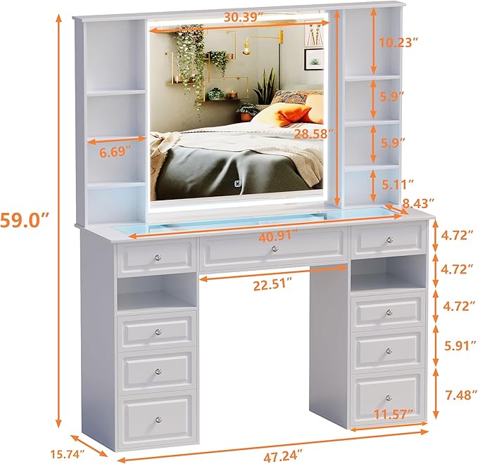 - 【Tall Vanity Desk with Large Storage】 The makeup desk is designed with 9 drawers, 2 hollowed out storage spaces allow you to easily place various commonly used items such as curling sticks and hair dryers, easily organize your makeup, jewelry and other accessories. Also, The make up desk top also has plenty of space for your computer or other office supplies. Save money and space, make your daily routine more perfer