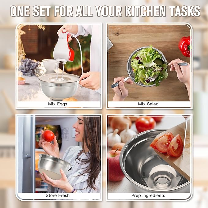 - NON-SLIP SILICONE BASE FOR STABLE MIXING: All bowls are equipped with wide silicone bottoms to prevent slipping and tipping. Whether you're whipping cream or kneading dough, the stable base ensures clean and stable prep every time. Rolled rims ensure drip-free pouring and a comfortable, secure grip.