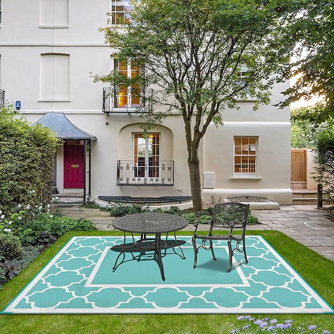 GENIMO 6' x 9' Outdoor Rug Waterproof for Patio Decor, Reversible Plastic Straw Area Mats Carpet for Camper Clearance, Outside Carpet for Rv, Deck, Porch, Beach, Balcony, Aqua Blue & White