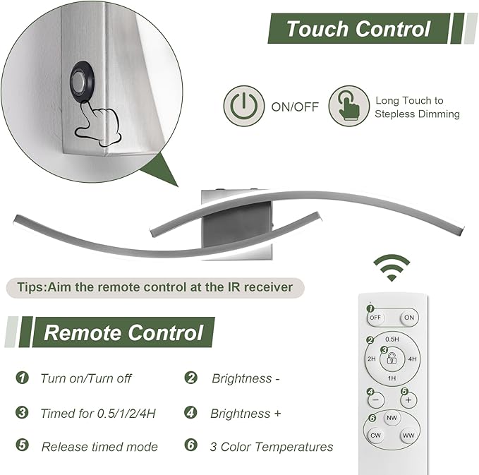 - Dual Control Options: Remote & Touch Our wireless battery-powered wall sconce offers dual control functionality. Effortlessly turn the lights on/off and adjust their brightness using either the remote control or by simply touching the light fixture button. Each remote boasts a remarkable range of up to 15 feet, allowing seamless control over all battery-operated sconces within this distance