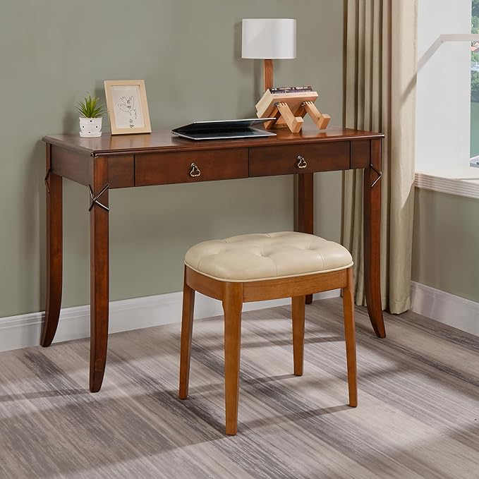 Solid Wood Button Tufted Vanity Stool, Ottoman Stool with Wood Legs & Padded Seat PU Leather Upholstered Piano Bench with Non-Slip Foot Pads Accent Chair for Bedroom Entryway, Beige