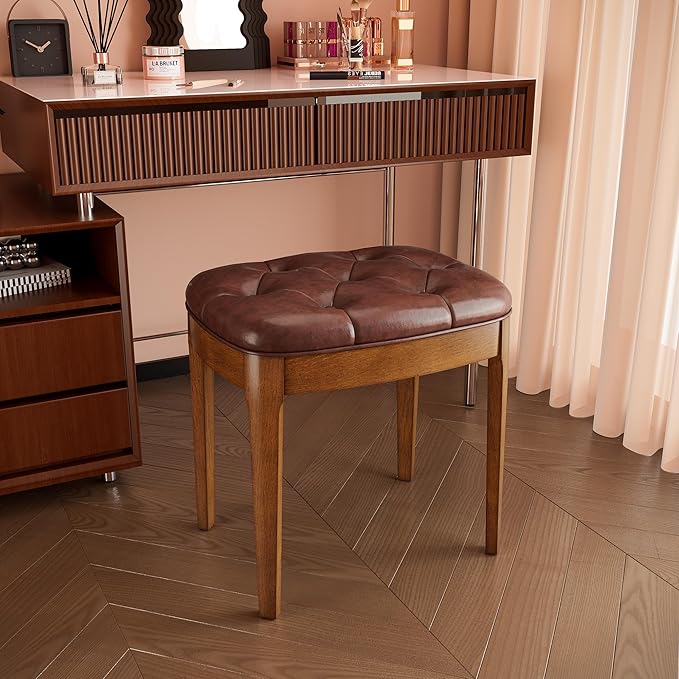 Solid Wood Button Tufted Vanity Stool, Ottoman Stool with Wood Legs & Padded Seat PU Leather Upholstered Piano Bench with Non-Slip Foot Pads Accent Chair for Bedroom Entryway, Wine Red
