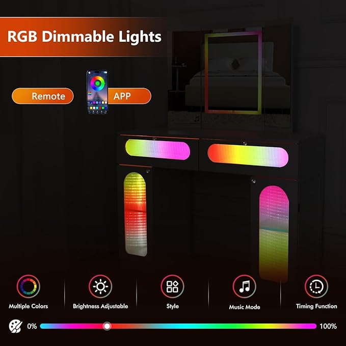 - [Remote & APP Control]: LED RGB vanity desk with lights can be controlled by mobile APP& remote control,which supports adjustment of color modes, brightness,speed,music(The lights flash in rhythm with the music)and timing options.