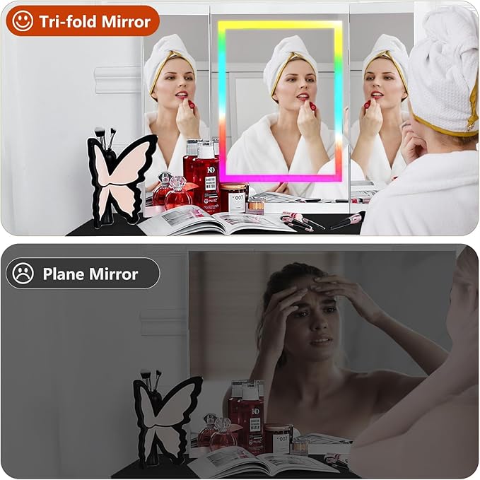 - [Tri-fold Mirror Dressing Table]:Our fixed angle triple fold mirror offers multi-angle viewing, more angles of the face than a normal flat mirror, providing great convenience for daily make-up and skincare.