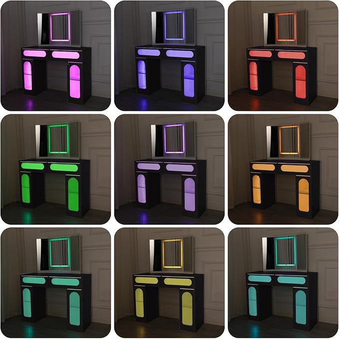 - [RGB Vanity Desk Led Lights]:This RGB vanity desk has a total of 24 static lights and 7 dynamic lights,perfect for festivals, events,parties,performances and exhibitions,he flowing lights will be the highlight of the party.
