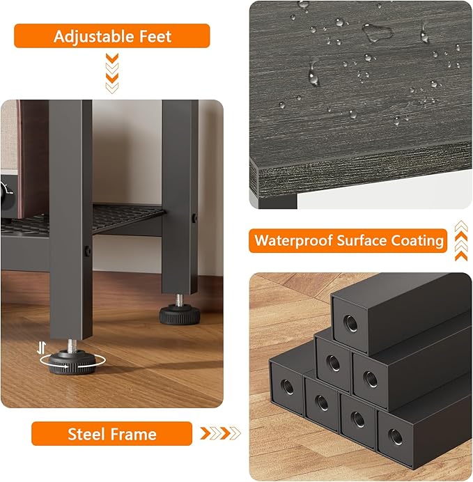 - Sturdy TV Table: The combination of exquisite particle board and metal frame provides stable support for the tv entertainment center. Adjustable feet to keep level and avoid scratching the floor. The mesh shelves can support up to 25 lbs, the wooden top can support up to 45 lbs.