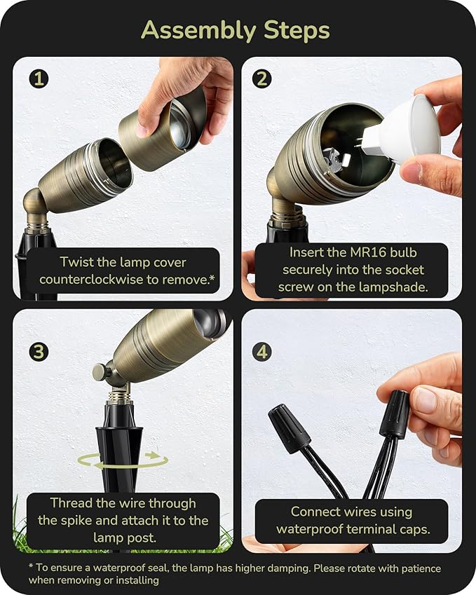 - [Safe & Long-Lasting] Includes heavy-duty ground stakes and 6FT premium copper wire for secure installation; brass landscape lighting with separate bulb and housing, you only need to replace the bulb—not the entire fixture, long life and low costs