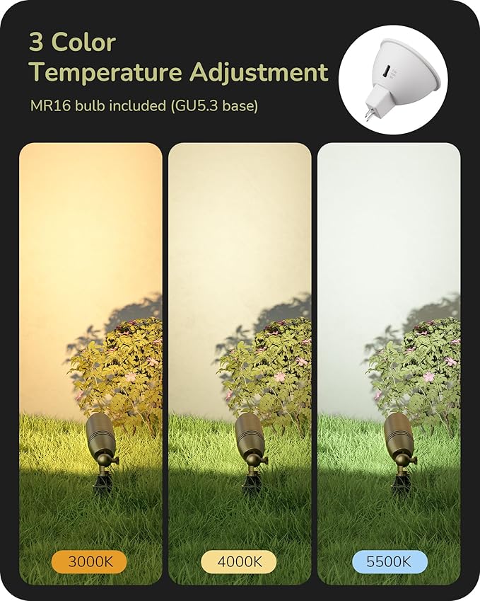 - [MR16 Bulb with 3CCT] This low voltage landscape spot light is equipped with a GU5.3 bi-pin base for MR16 bulbs, 3CCT to DIY your favorite vibe from three color temperatures to suit any season, mood, or holiday; mix wattages and colors to create stunning visual effects