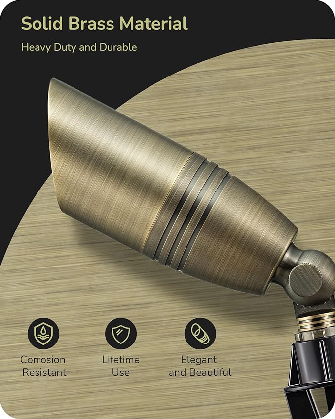 - [Solid Brass Construction] The solid brass landscape spotlights are built to withstand the elements, crafted with thick die-cast brass and a weather-resistant acid-washed finish; for outdoor use, it resists corrosion, moisture, rain, and snow; long-lasting beauty in your yard