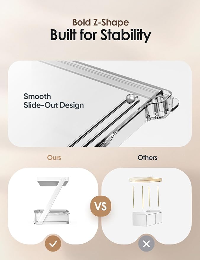 - [Smooth Slide, Smart Storage – Designed for Daily Use] Tired of knocking over bottles or digging through chaos? Our upper layer slides out effortlessly to give you quick access to your everyday essentials, while the lower drawer stores smaller items like makeup brushes, lipsticks, or accessories.