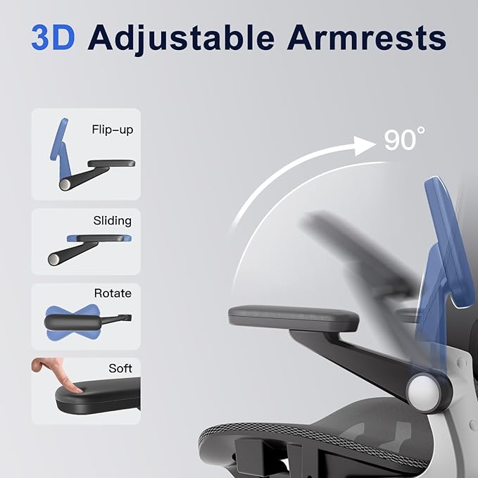- 3D Armrests: The armrests of the ergonomic chair can be fully lifted, moved forward, backward, and rotated 360 degrees, allowing you to customize the desired angle at will.