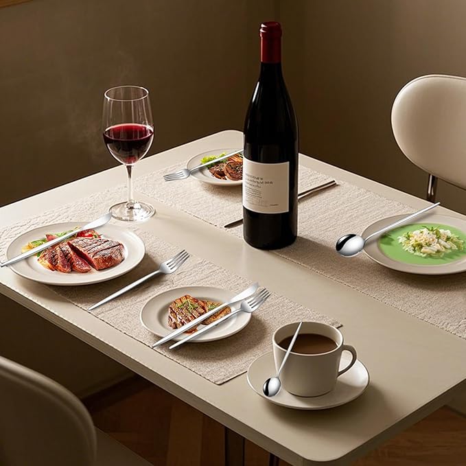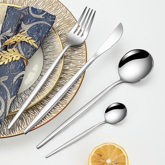 - Ergonomic Precision: This flatware set features slim, contoured handles with precision-balanced weight that deliver superior grip comfort. Its refined curvature naturally aligns with your palm for a secure, strain-free hold—whether cutting tough meats or savoring delicate desserts. Every tableware transitions seamlessly from casual breakfasts to formal dinners