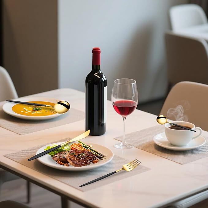 - Luxe Gold-Tone Tableware with Black Handle: Elevate your table with bold sophistication – gold-toned flatware dramatically contrasted by matte-black handles. The ergonomic handles boast a secure non-slip coating and balance for comfortable grip control - you'll receive compliments at every gathering