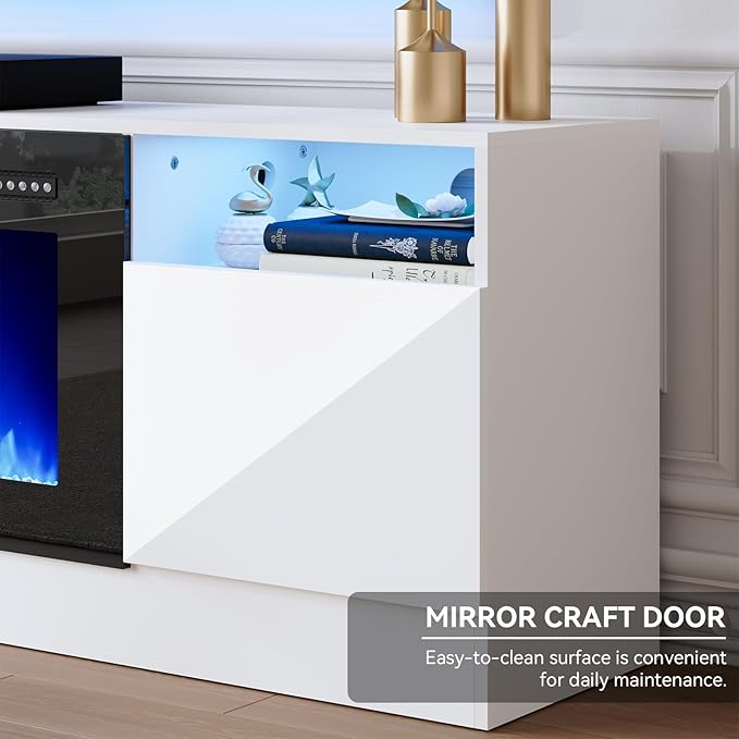 - TV Stand with Electric Fireplace: Our fireplace TV stand is equipped with a white 36" electric fireplace, which comes with 12 colors of backlight, 12 colors of light strip, 12 flame colors and 5 levels of flame brightness, providing different viewing experience and ambience with the remote control