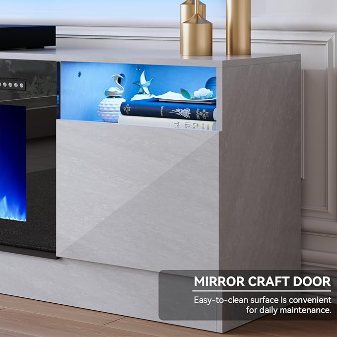 oneinmil 70” TV Stand with 36” Electric Fireplace, Large Modern Media Entertainment Center with Storage Cabinet and 12 Colors LED Lights for TVs Up to 80", Gray TV Stand and Black Fireplace