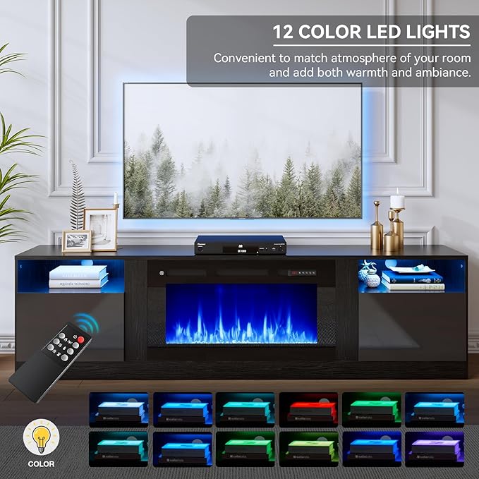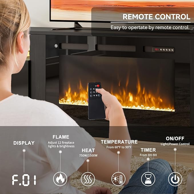 - TV Stand with Electric Fireplace: Our fireplace TV stand is equipped with a white 36" electric fireplace, which comes with 12 colors of backlight, 12 colors of light strip, 12 flame colors and 5 levels of flame brightness, providing different viewing experience and ambience with the remote control