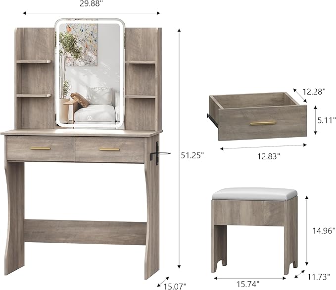 - 【STURDY & DURABLE】Grey makeup vanity with mirror and lights is made of warp-resistant particle board, which is smooth and durable. Vanity set mirror with lights make your desktop more tidy and clean, which can match perfectly with other furnitures in your bedroom and dressing room. The additional anti-tipping device improves the stability and safety of the dressing table, always protecting you and your family.