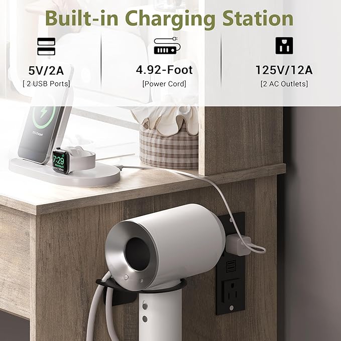 - 【CHARGING STATION】Compact vanity desk with charging station has 2 outlets and 2 USB ports, promotes efficiency by reducing cord clutter with a back cable hole, which make this vanity desk with mirror and lights can provide convenient charging options for your mobile devices and hairdressing tools.