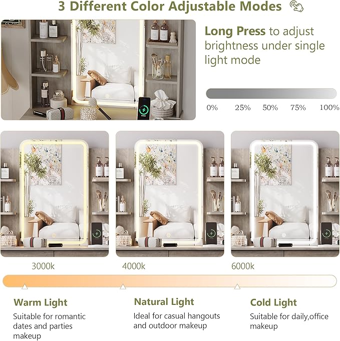 - 【VANITY MORRIR WITH LIGHTS】 The makeup vanity has equipped with an RGB LED lighting system, which can be controlled via APP or the switch.There are many static colors & dynamic modes and light flashing modes to create a beautiful ambiance. White vanity desk with touch smart switch can be switched 3 different color temperature, adjusting the brightnes by long pressing the screen, which provides you with the perfect ambiance for your makeup and daily skin care.