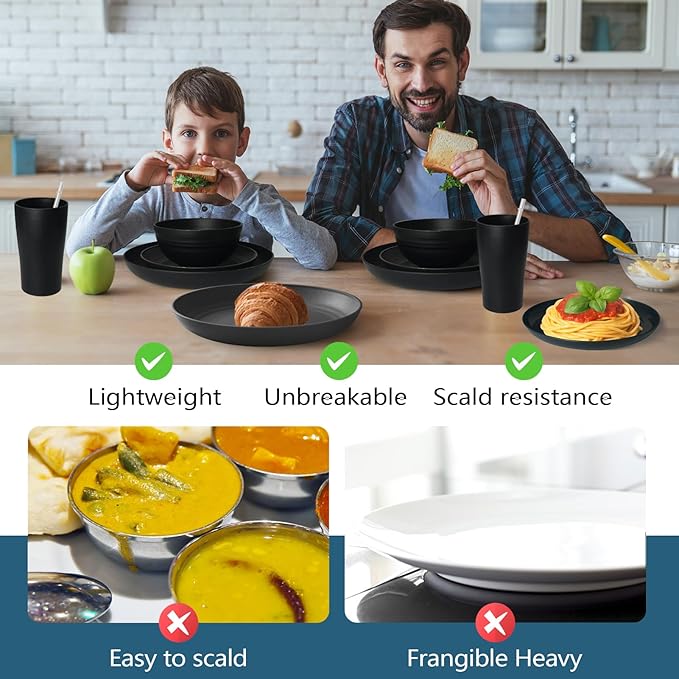 Teivio 80-Piece Kitchen Plastic Wheat Straw Dinnerware Sets for 8, Dinner Plates, Plates and Bowls Sets,Cups, Flatware, Dishwasher Safe, Unbreakable Apartment Outdoor Camping Dishes, Black