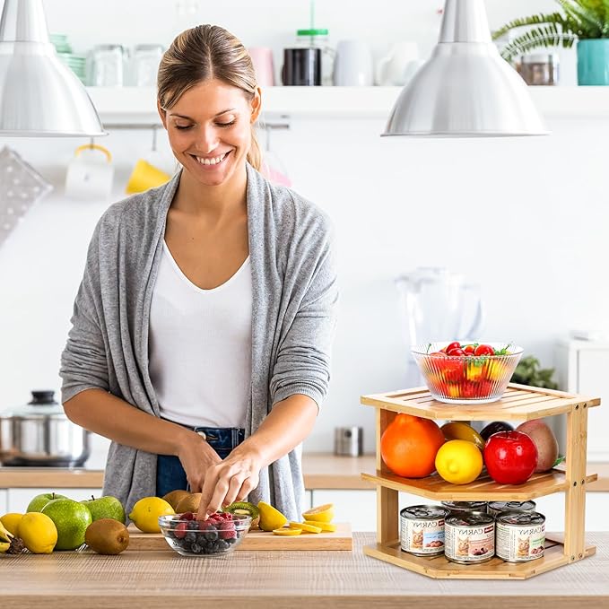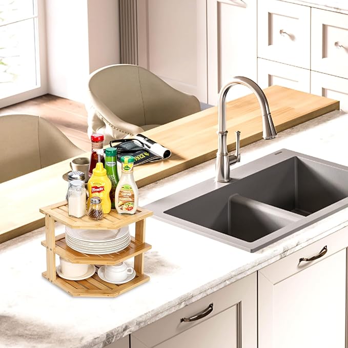 - SAVE SPACE IN THE KITCHEN: This Bamboo Corner Shelf for Cabinets Reasonable Use of Corner Space, Easy to Store and Access, for the Stacking of Plates to Find a Reasonable Storage Location