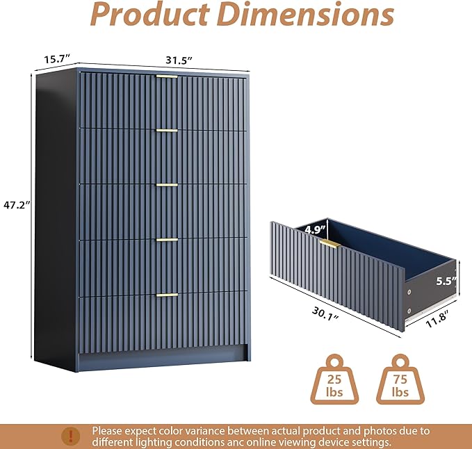 - Dresser with Large Drawer: Ideal for bedrooms, living rooms, offices, and entryways, this 5 drawer dresser offers three deep drawers (11.8” depth) to organize clothing, accessories, books, or home essentials. The spacious top surface provides room for decor, lamps, or daily necessities, maximizing both style and utility.