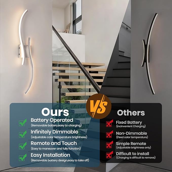 - Modern style and simple design of the wireless battery wall light is ideal for living room, bedroom, entryway, hallway, and dinning room, makes the room seem cozy, enhaces the overall aesthetics