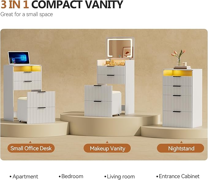 - 【3 in 1 Vanity Desk】: This dressing table combines a vanity, nightstand, and chair into 1 unit. By flipping up the mirror and rolling out the chair with wheel, it serves as a makeup vanity set. When the mirror is closed, it transforms into a bedside table with storage