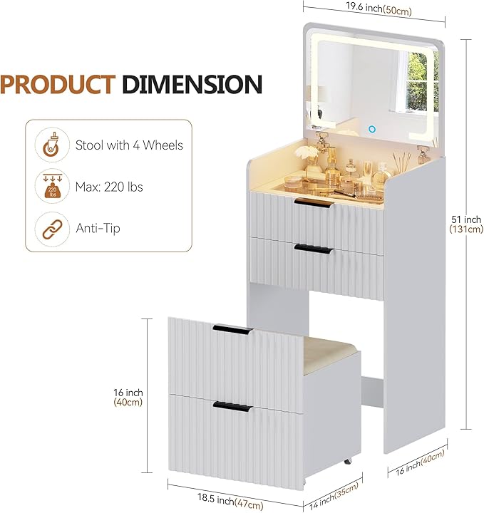 - 【Ample Storage Space】: 20''(W)*16''(D)*51''(H) Compact makeup vanity is great for keeping cosmetics, perfumes, and jewelry organized. It includes a hidden compartment for upright storage of tall skincare bottles. Maximizing the use of space without losing style! Suitable for bedrooms, apartments, living rooms, etc.
