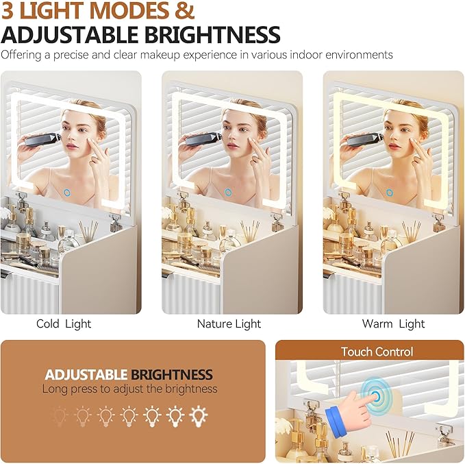 - 【3 Color Dimming Light】: The dressing table features a 3-color light(nature/warm/cold) and adjustable brightness, Offering a precise and clear makeup experience in various indoor environments. Whether you are preparing for a new day or looking glamorous at night, you can easily handle it